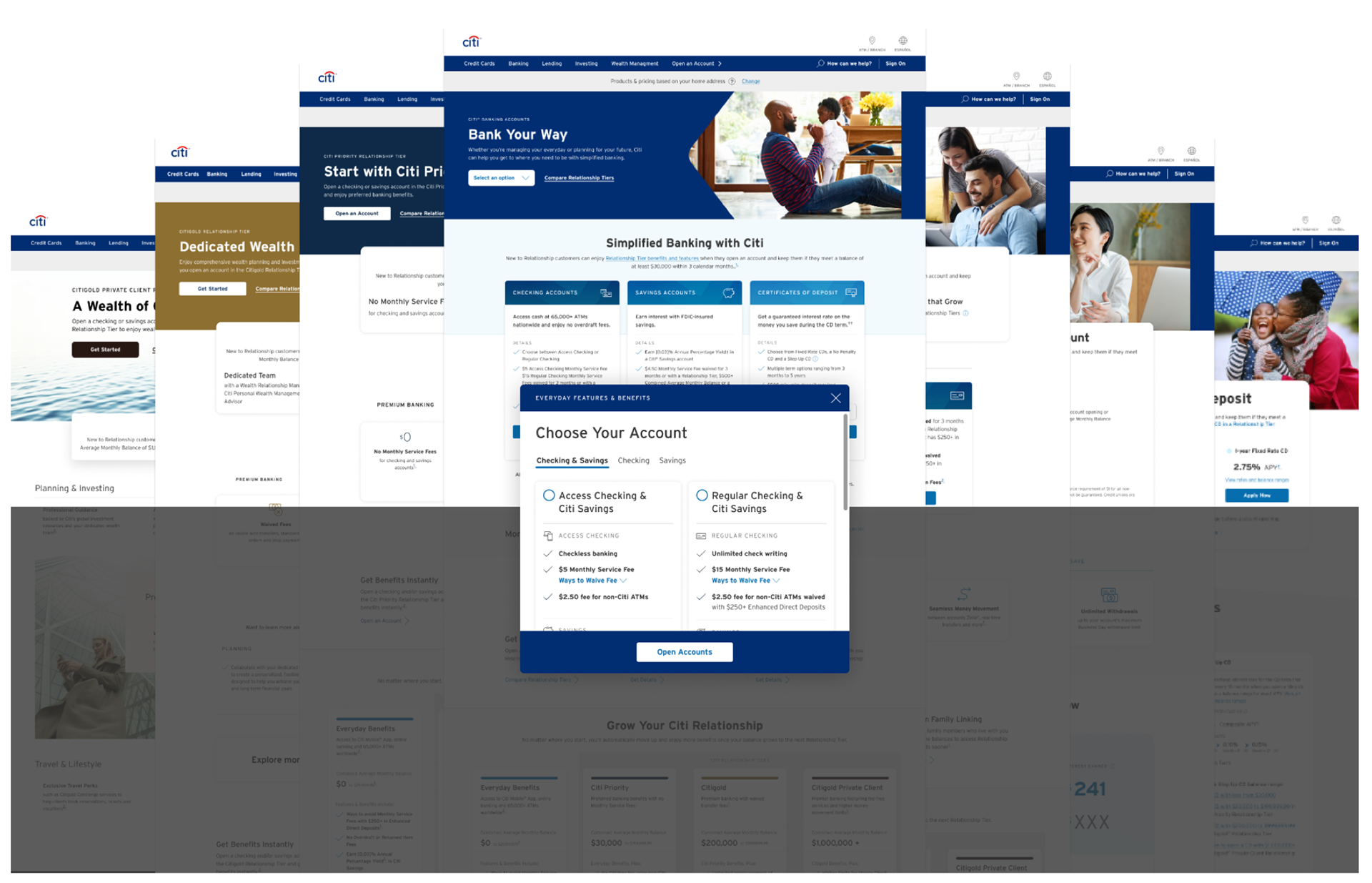 Citi recently eliminated the number of account packages and converted to a new simplified banking experience and reward system. The objectives were to educate new and existing customers on Citi's new banking products and tier relationships without overloading visitors with information on the product detail pages.