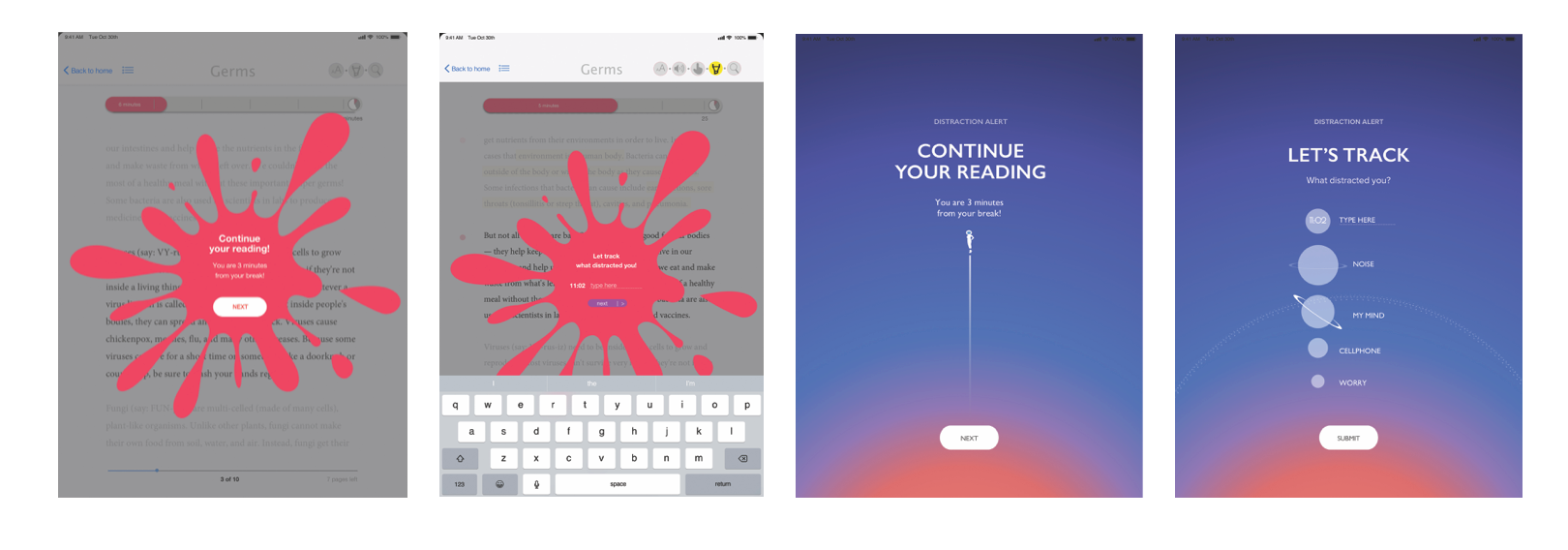 I proposed a tablet application that revamps the teacher’s strategies in order to create an environment to enhance concentration. In this concept, the text is converted into an uncluttered and spacious layout. The app perceives distractions and calls back student’s attention. Also, it encourages students to record what distracts them in order to promote awareness. The app helps readers to clearly organize their thoughts.